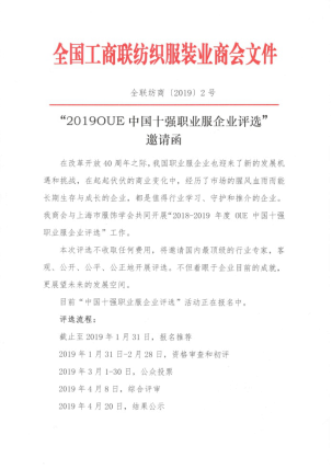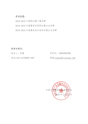 5.結果公示:主辦方將于2019年4月20日在OUE中國十強職業服企業評選頒獎晚宴進行頒獎。