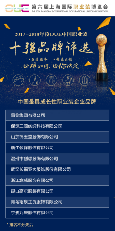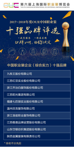 有別于2017-2018年度OUE中國職業裝十強品牌評選在上海國際職業裝博覽會現場頒獎。本屆OUE中國十強職業服企業評選頒獎晚宴將于2019年4月20日在上海浦東喜來登由由大酒店舉辦。屆時,現場預計有500名服裝行業大咖受邀盛裝出席,包括各服裝商會以及行業協會、國內外服裝企業領導、各大服裝院校領導等等,齊聚眾多服裝業最具影響力的人物。同時,各大行業媒體將全程直播報道。此次晚宴的目的不僅是為了向對中國服裝產業做出貢獻的個人和企業以表感謝,同時也為他們提供了一個絕佳的交流合作平臺。