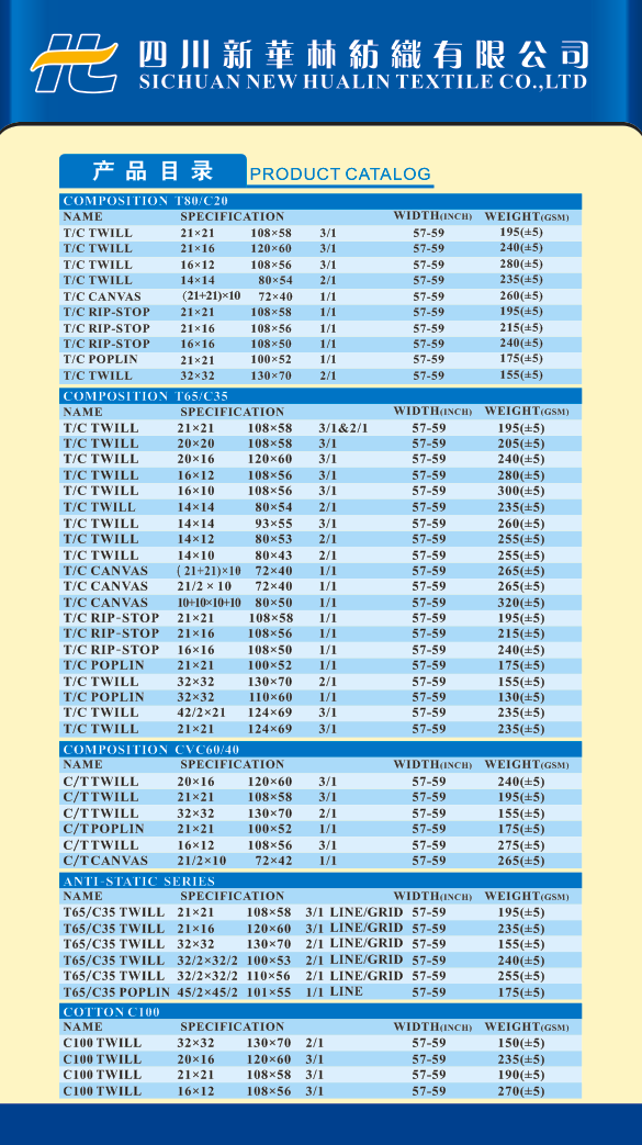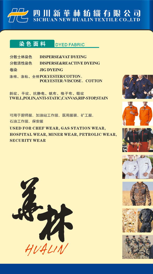 四川新華林紡織有限公司是一家專業(yè)生產(chǎn)工裝面料和經(jīng)營進出口業(yè)務的民營紡織企業(yè)。公司集紡紗、織布、貿(mào)易于一體,并通過與印染廠的合作,已向國內(nèi)、俄羅斯、東南亞等客戶提供優(yōu)質(zhì)的產(chǎn)品和服務。 公司位于四川省樂山市紡織工業(yè)園區(qū)內(nèi),占地40畝,擁有GA310高性能漿紗機1臺,高速箭桿織機300臺,噴氣大卷裝100臺,年產(chǎn)各類坯布1800萬米。工廠采用標準化廠房設計,通過精細化的管理,努力提升產(chǎn)品質(zhì)量,并著力打造企業(yè)自身品牌。 公司主營滌棉、滌粘、純棉類染色和印花面料,并滿足客戶對磨毛、抗靜電、阻燃、防酸堿、防水、防油、防污、抗紫外線、耐氯漂等功能型服裝面料的需求。 公司自成立以來,本著以質(zhì)量求生存的信念,堅持以客戶需求為導向,注重新技術、新工藝的開發(fā)與應用,使產(chǎn)品暢銷世界各地,并深受客戶好評。我公司以崇高的信譽保證,我們將以優(yōu)質(zhì)的產(chǎn)品和周到的服務與您攜手共利、共創(chuàng)未來,真誠期待與您的合作! Sichuan New Hualin Textile Co.,LTD is a private textile enterprise, which is a professional manufacturer of uniform fabric and managing import/export business. Company set spinning,weaving,trade in one, and through cooperation with printing & dyeing plants,we have been to provide excellent quality fabric and service to domestic, Russia’s, Southeast Asia’s and other region’s customers Our plant is located in Textile Industrial Park Leshan City Sichuan Province, it covers 40 acres, is equipped with 1 high performance GA310 sizing machine and 400 high-speed rapier looms, produces 15 million greige fabric per year. Standardized plant design and elaborate management mechanism are used, and we always focus on building our own brand by striving to improve the quality of the product. Our company provides all kinds of dyeing & printing uniform fabric includes polyester, cotton, and viscose, meeting the customers’ needs of special functional fabric, such as sanding,anti-static,flame retardant,anti-acid,waterproof,anti-oil,anti-pollution,UV resistance, bleaching resistance and so on. Since the foundation of company, our faith is Quality First, Customer Demand First, so new technologies and new production process are developed and applied,which make our products sell well both in home and abroad markets, and also welcomed by customers. We firmly believe excellent quality of fabric and service will be provided continuously ,and we will be with you hand in hand, create a better future, sincerely look forward to cooperate with you!