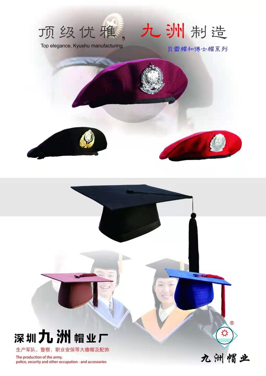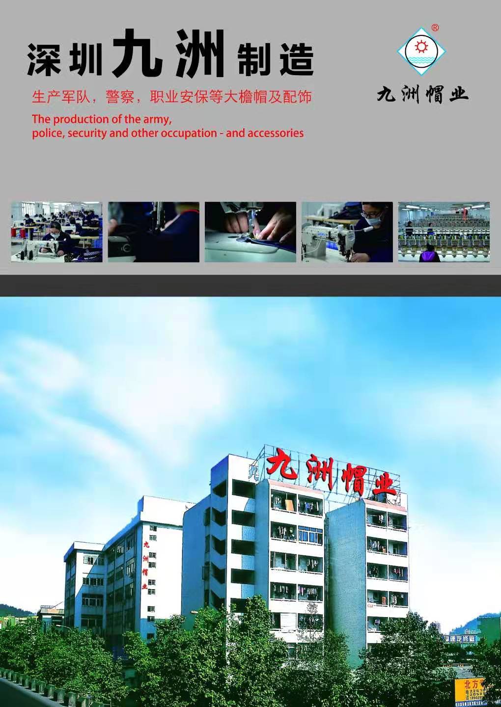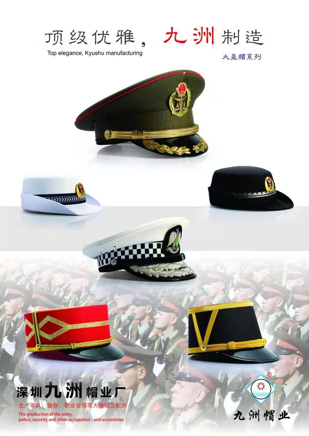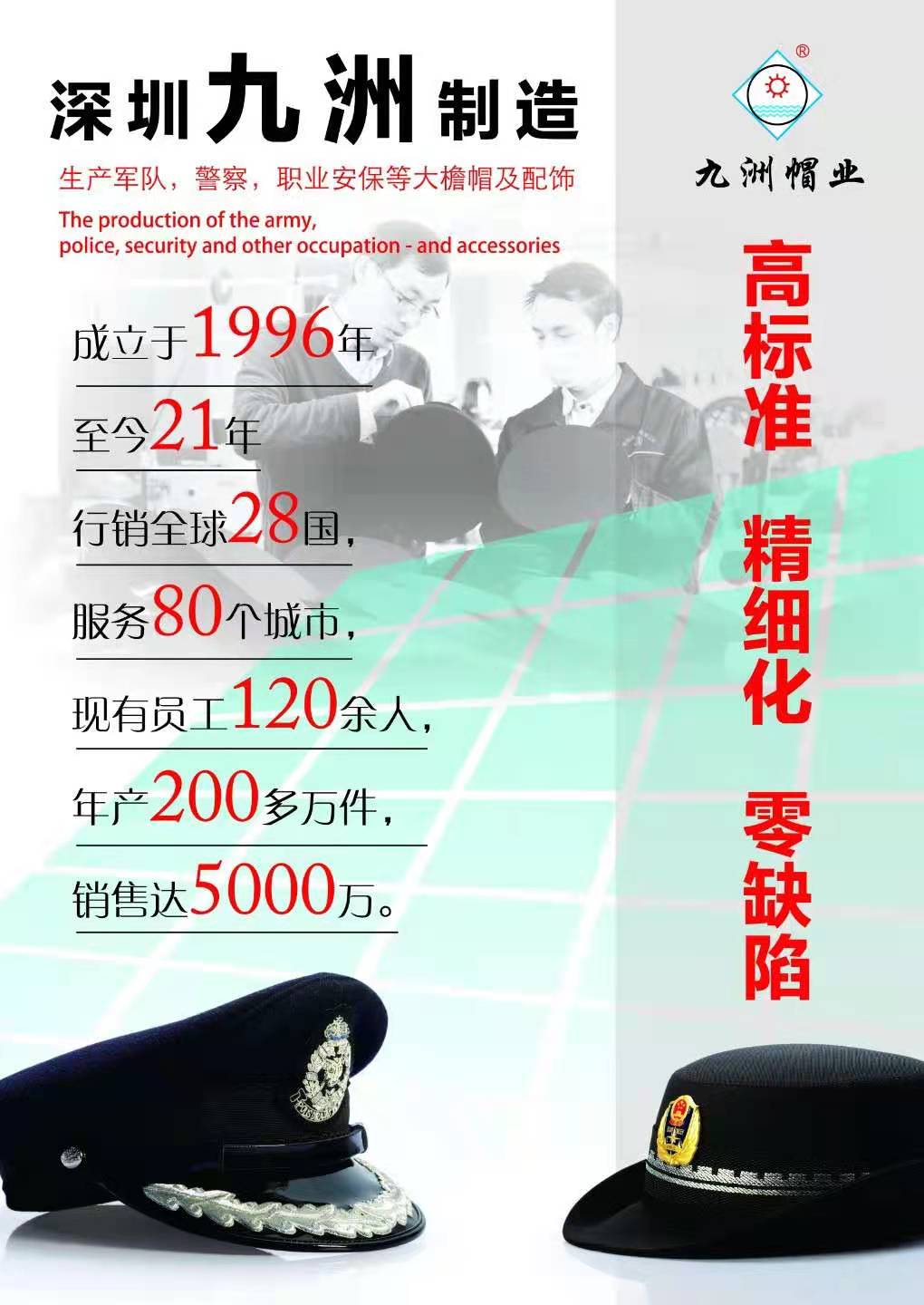 九洲帽業制造有限公司成立于1996年,是深圳市一家實力雄厚的專業制帽企業,主要特色產品是世界各地的軍警帽及保安大蓋帽。本司有先進的生產設備和一流的專業制帽技術人才,以時尚的設計,精湛的做工,合理的價格,贏得了海內眾多優質客戶。 生產軍隊,警察,職業安保等大檐帽及服飾。 成立于1996年,至今21年,行銷全球28國,服務80個城市,現有員工120余人,年產200多萬件,銷售達5000萬。 九洲帽業,是國家注冊商標。